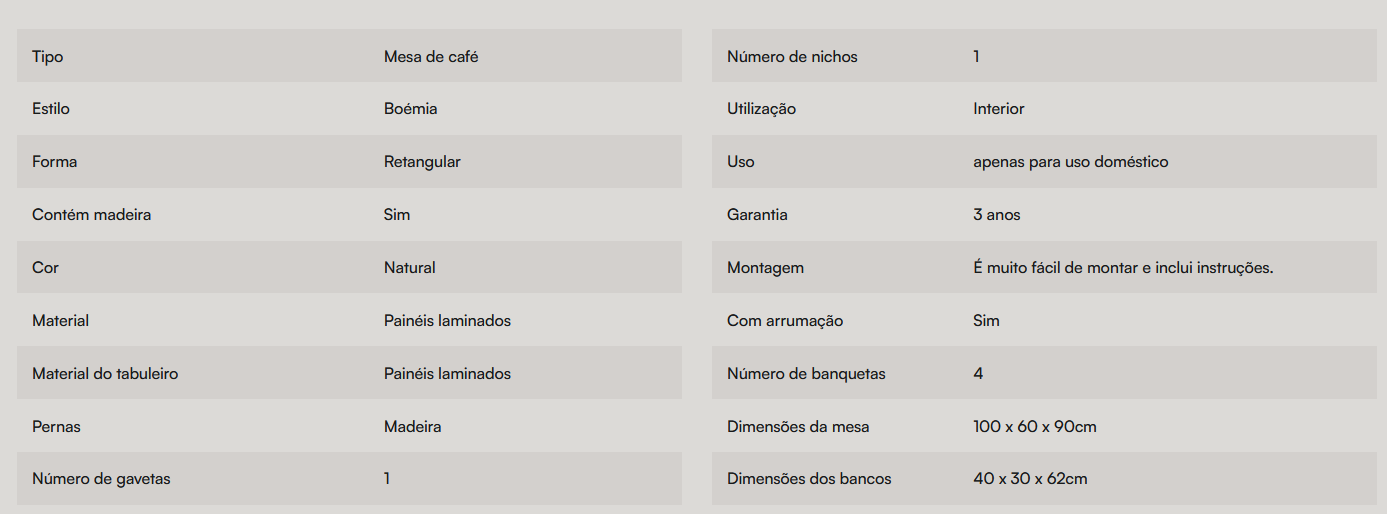 Todos os nossos produtos têm uma descrição detalhada dos materiais, bem como das medidas e características.
